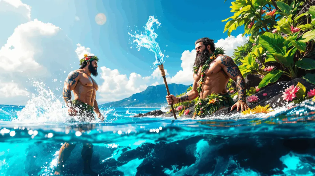 • Mythos 1: Die Schöpfung der Inseln – Kāne und Kanaloa formen Hawaii aus dem Nichts, indem sie Quellen und Flüsse schaffen, die das Land nähren.